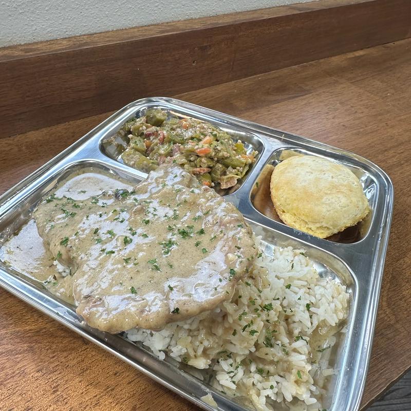 Biscuit and sausage gravy, grits, and 2 eggs your way.