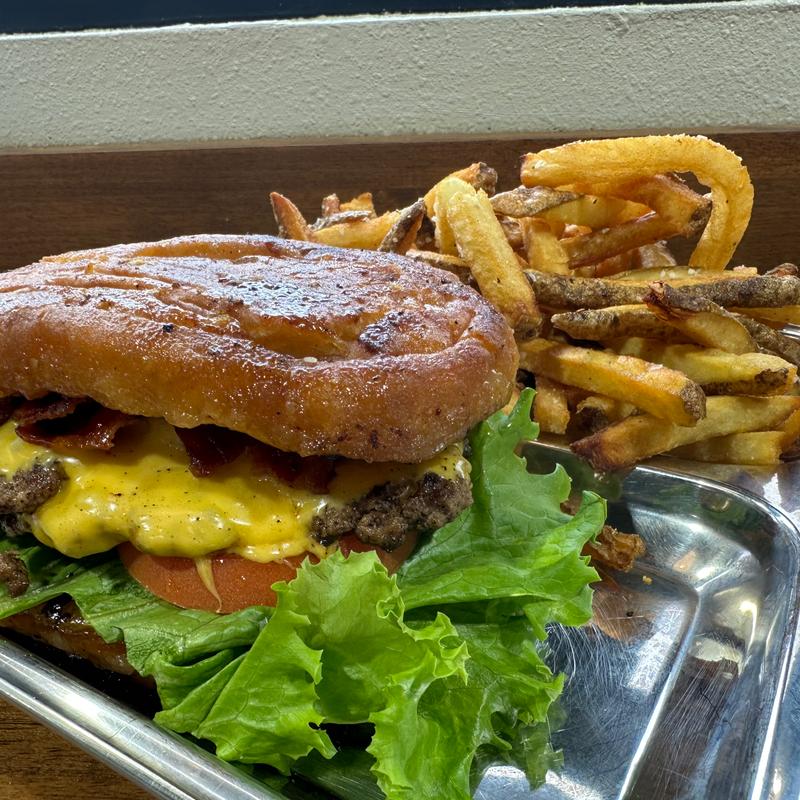 Honey Bun Smashburger. Two beef and pork patties topped with American Cheese and Bacon, dressed with Lettuce and Tomato and House sauce. All served between 2 grilled Honey Buns. Comes with hand cut fries, or Zapp's Potato chips. Sub Onion rings $1